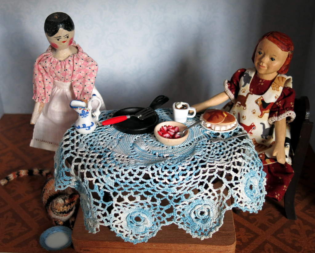 I love your observation that the cat “looked “meaningfully at the cream jug”! What a tasty way to spend part of the day-with pancakes! and…in the Quimper dining area, it looks most homey.