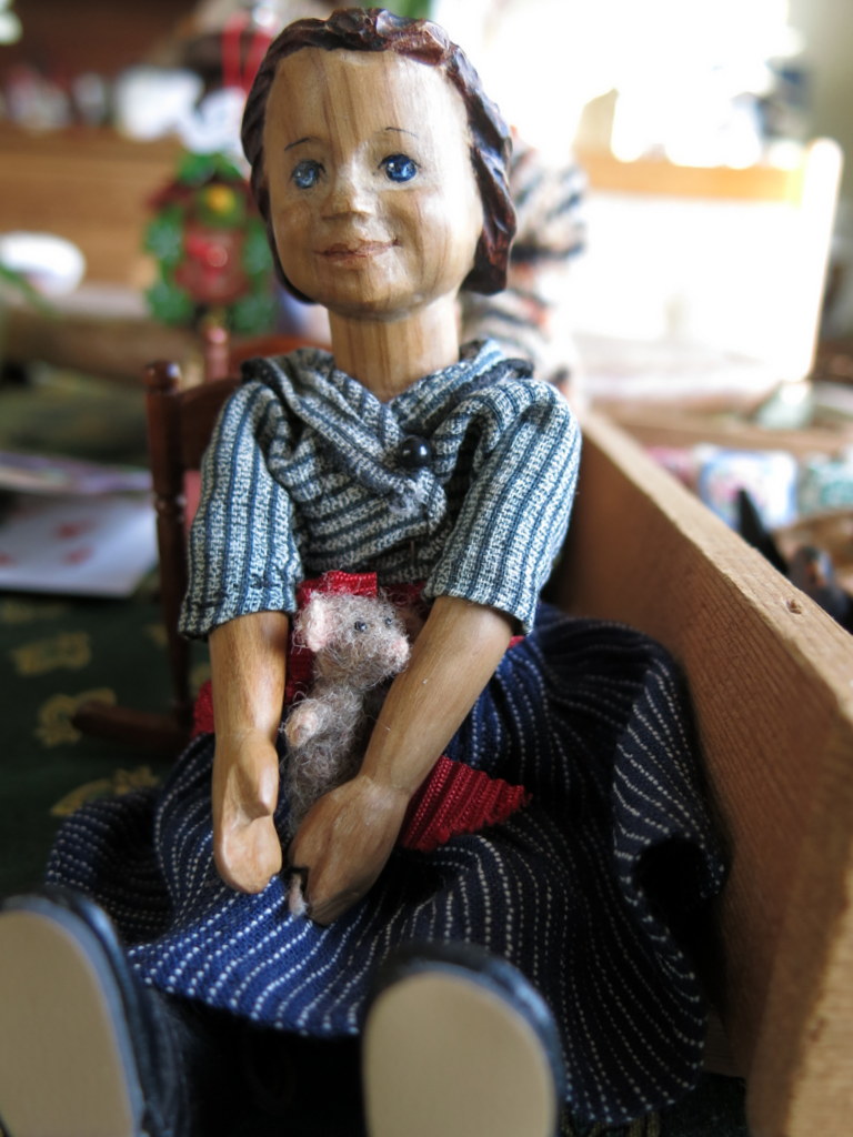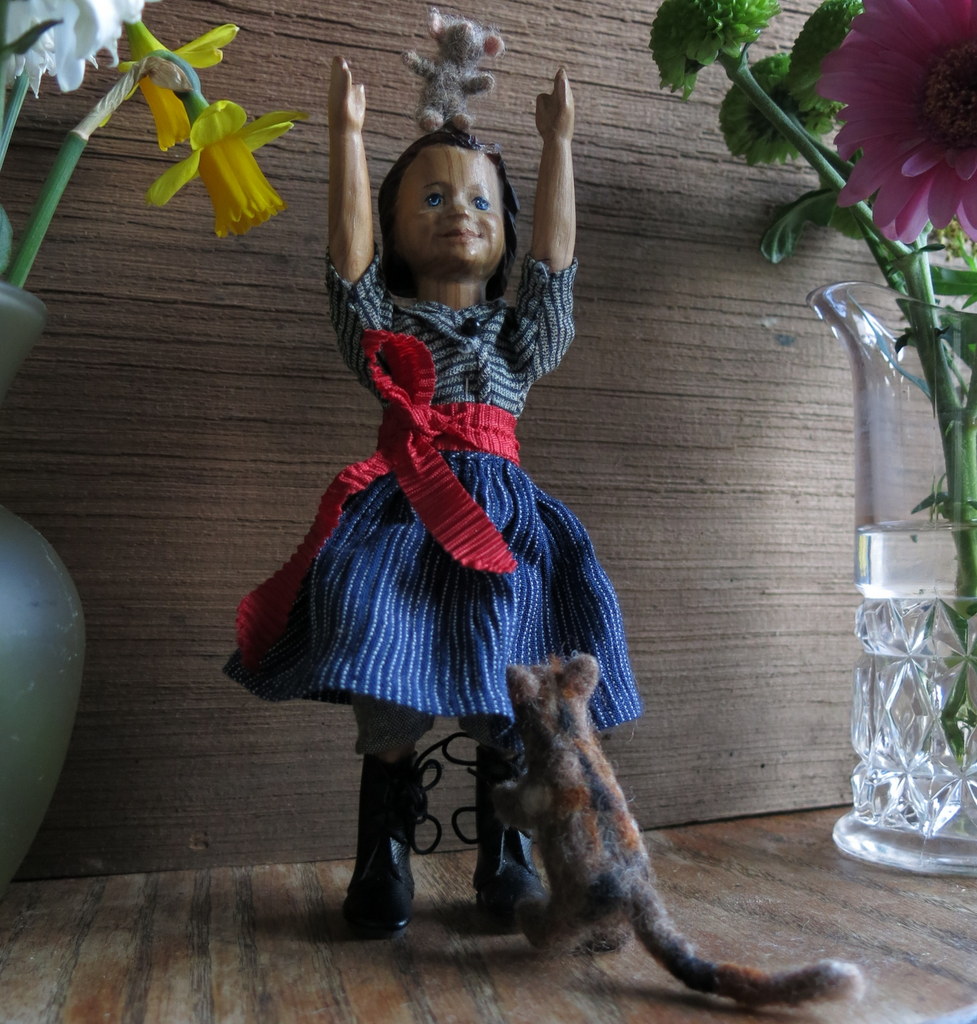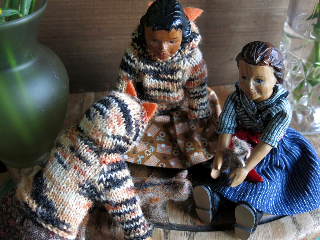 Gráinne is happy with her new wee felted critter; the Mouse is happy to have been useful to the Quimper Hittys; and the cat-girls are distracting the cat for the moment!