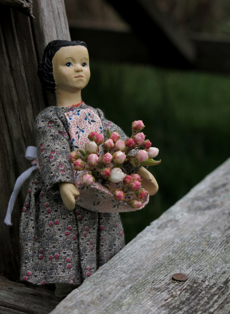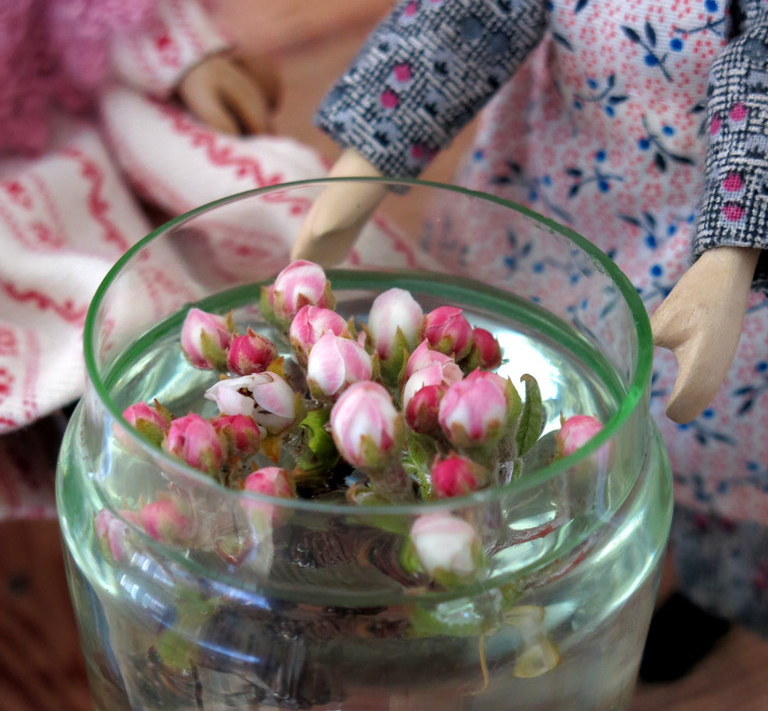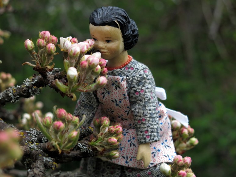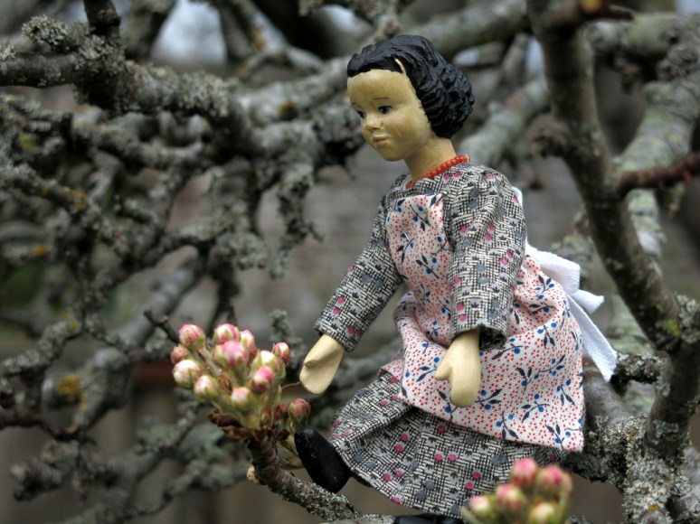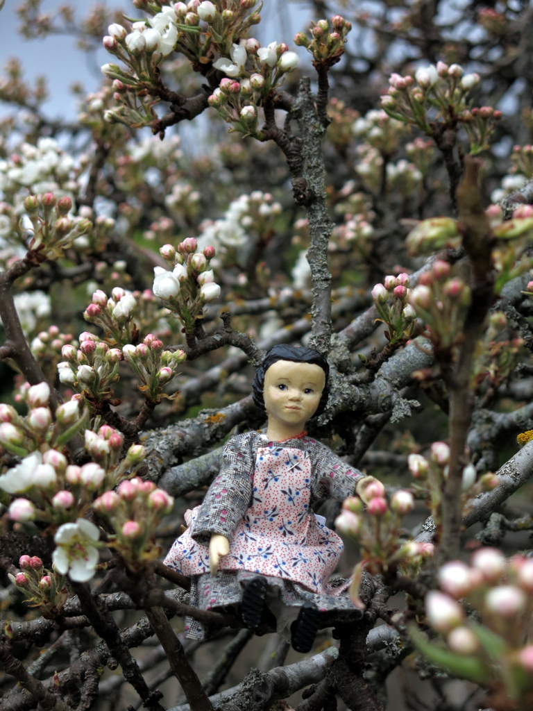 1. Patience looks so pretty perched up in the branches of your pear tree. Her hitty dress harmonizes with the flower clusters. Beautiful.