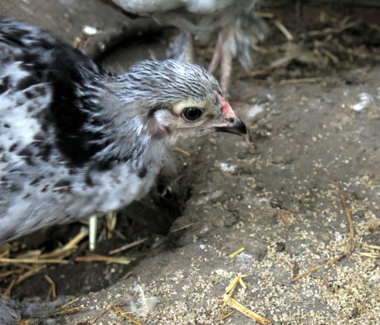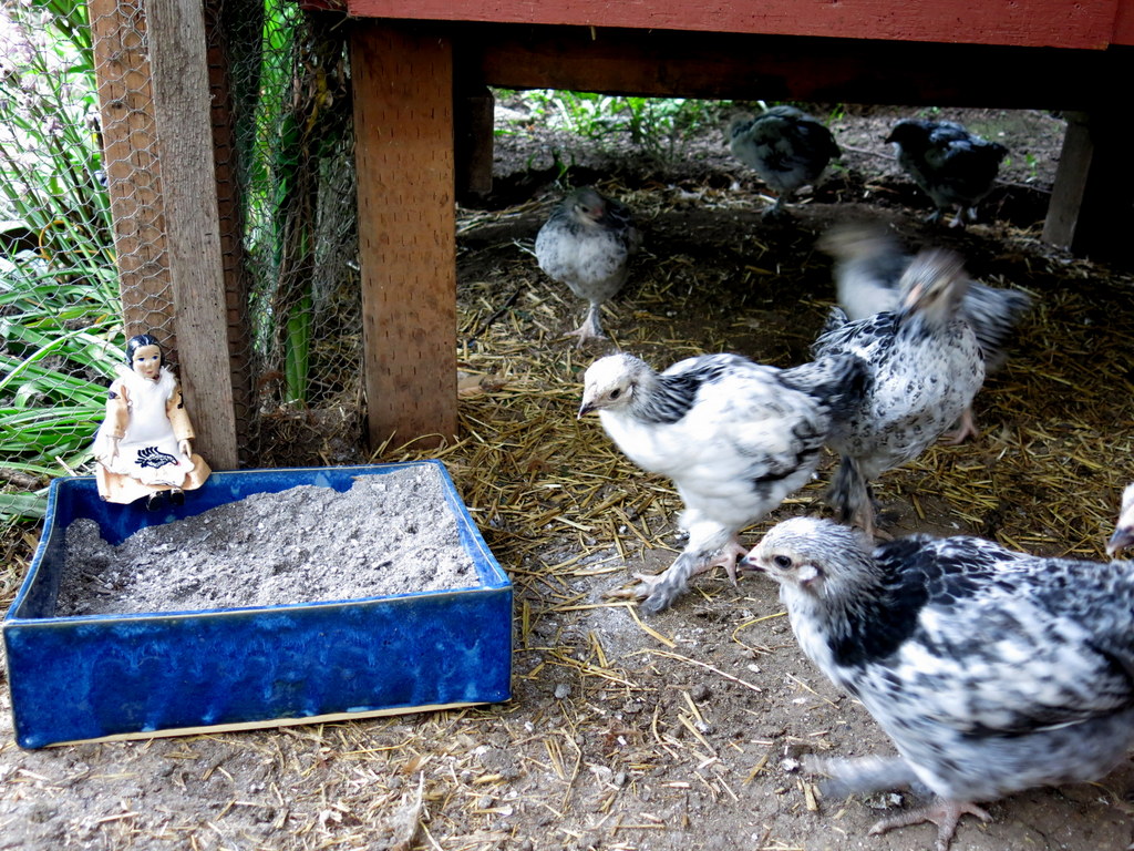 Tansy wore her special black-and white chicken apron for her audience with a friend’s Brahma chicks…