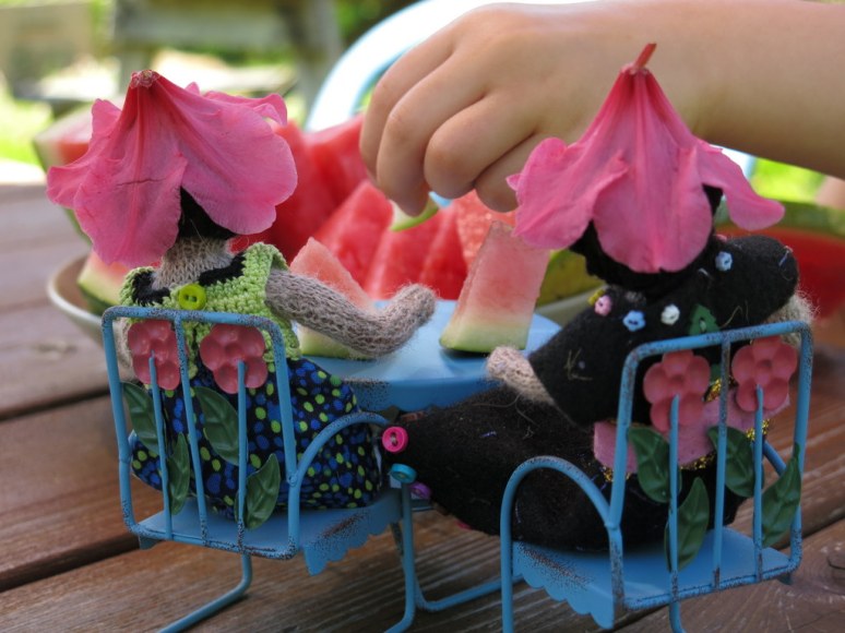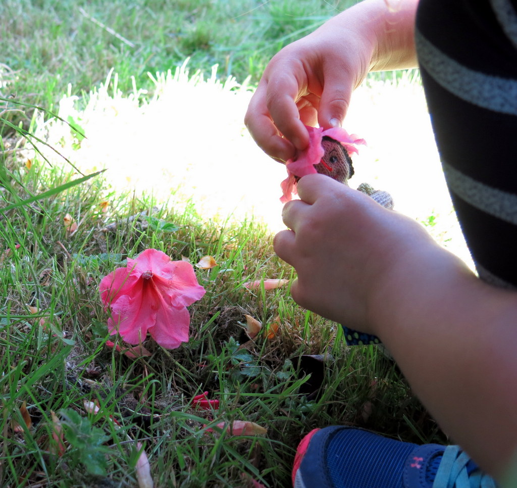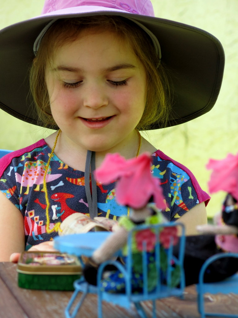 5. Very charming.. love those hats. Made me recall making little fairy dolls from Hollyhock blooms! Great photos and what wonderful fun and memories you are both making!