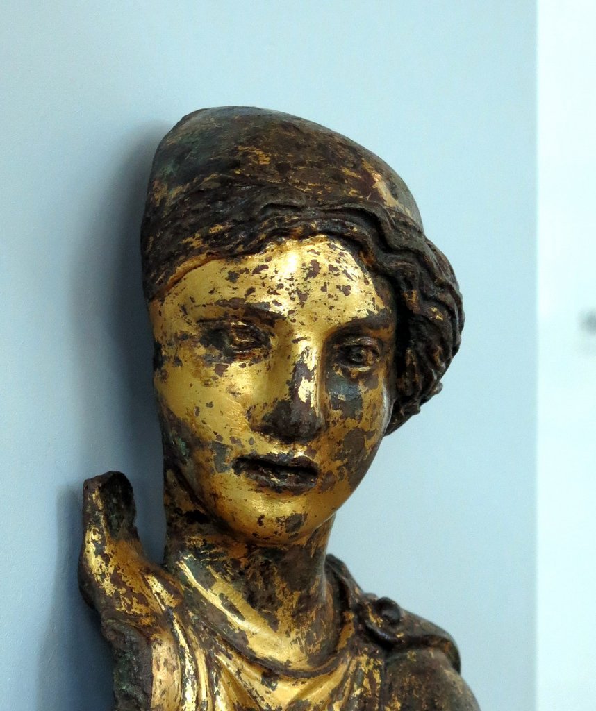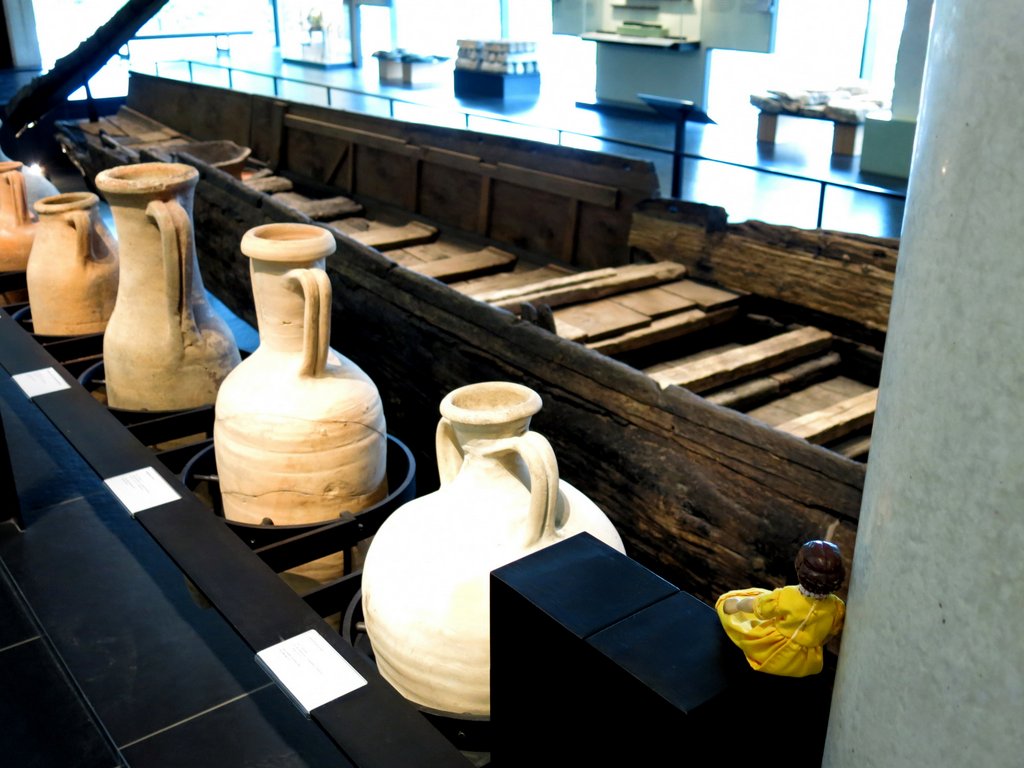 The museum has an almost complete wooden riverboat. This barge would have taken on a load from sea-going vessels, then be hauled upstream by people on the towpath. Then the wine, oil, and fish-paste-filled amphorae; lead ingots; marble etc would be emptied at the next river port, and the boat was poled back down to Arelate for another load.