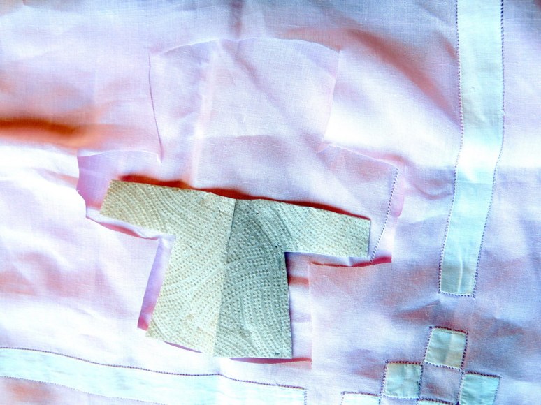 I found a pink linen tablecloth…worn, stained and with blobs of candle wax melted in…