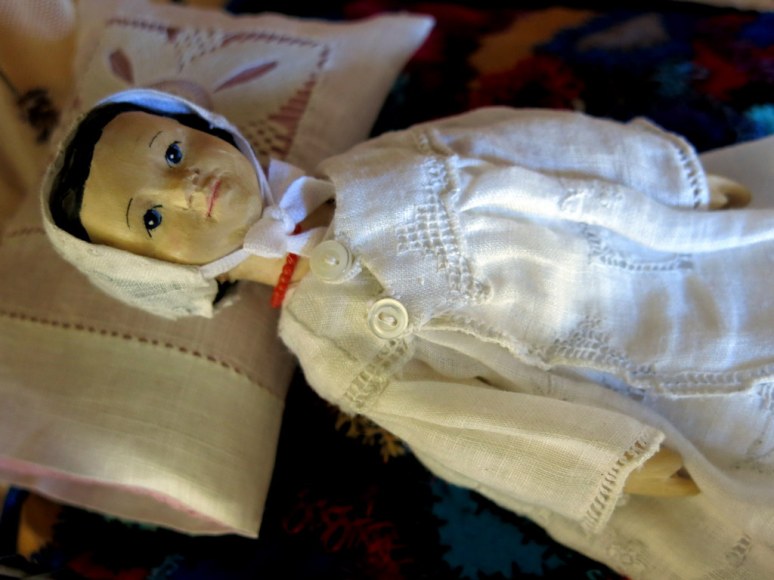 what a stack of wonderful quilts and that pillow and pillow roll on the floor are beautiful! The Quimper Hittys have quite a lovely collection. I do not blame Patience for fearing a tumble.. Her night gown and cap are so pretty.