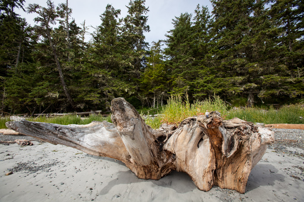 At the beach edge was a huge stump with a wig of coastal plants