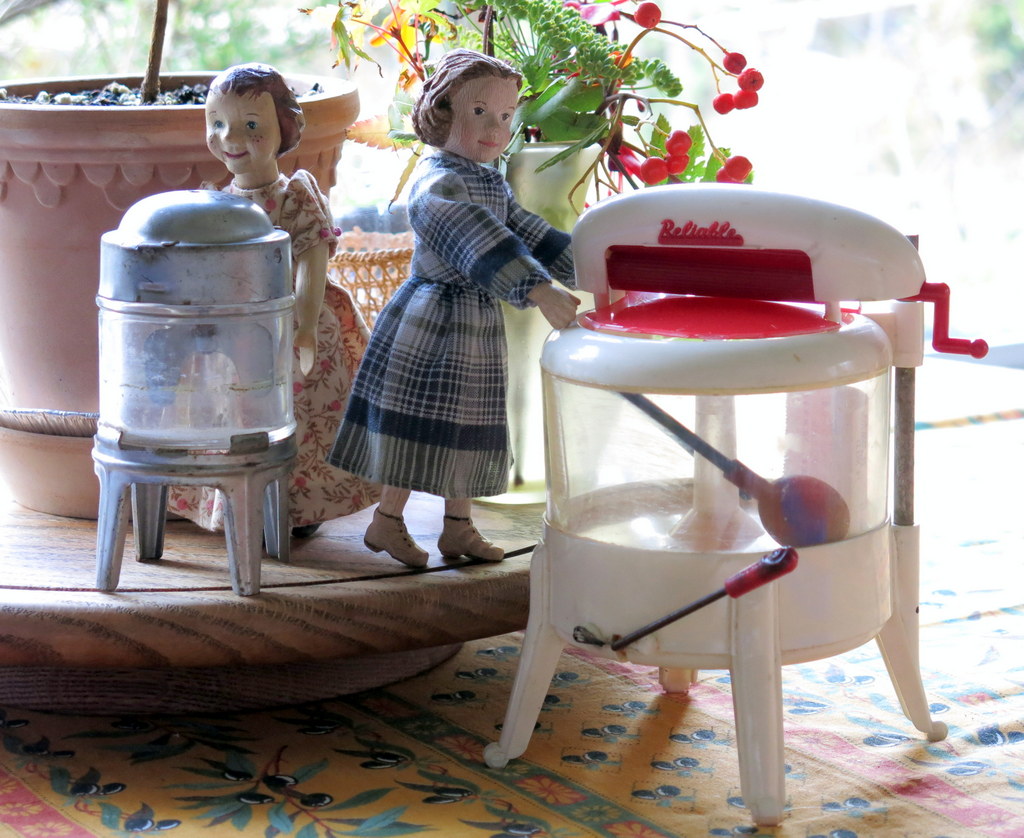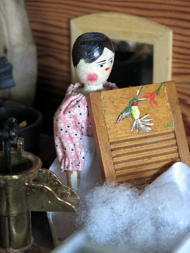 Jane is fond of scrubbing, fortunately for the rest of the Hitty cupboard…however we hope to relieve her of at least a bit of her housework, and are going to try to repair the “Little Miss” washer, though I believe it came with a separate bucket with attached mangle.