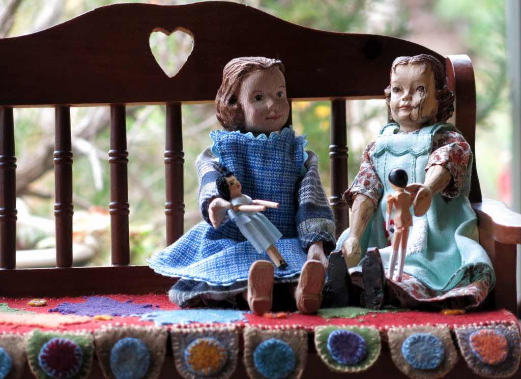 The doll’s dolls were just waiting for little girls to play with them…Judy Brown made the little one in the blue dress, and the little one in it’s all-together came from Polluck’s Toyshop in the UK but was made in Italy.