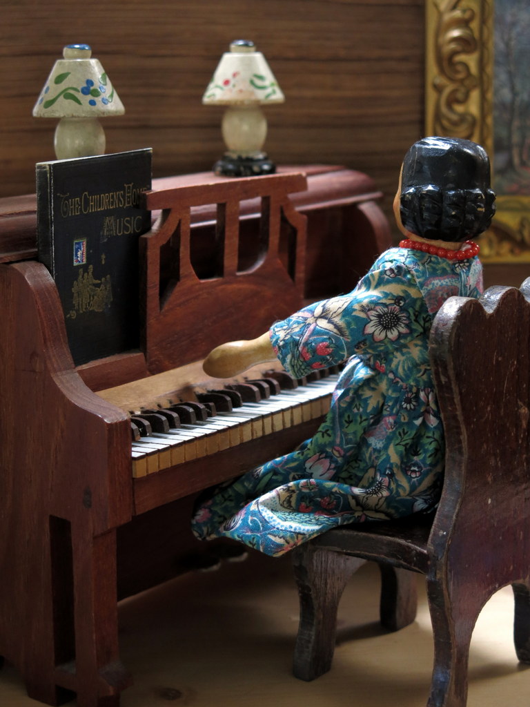 • We adore this piano, which we found in a thrift store! The Quimper Hittys sing very enthusiastically when Rose gets them going, though she wishes they would also keep time and sing in tune!