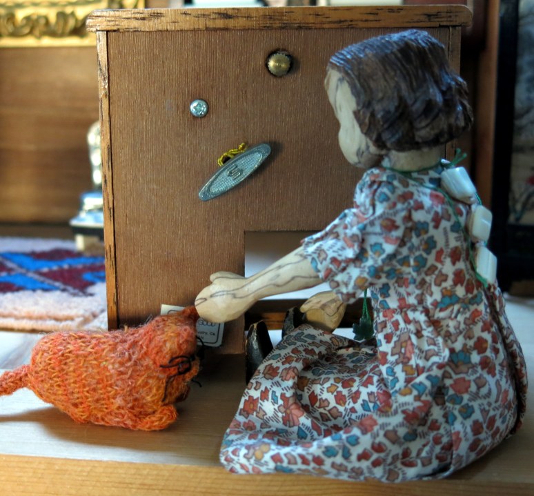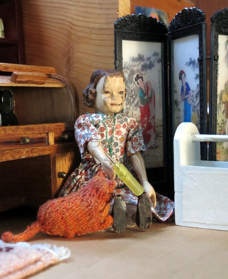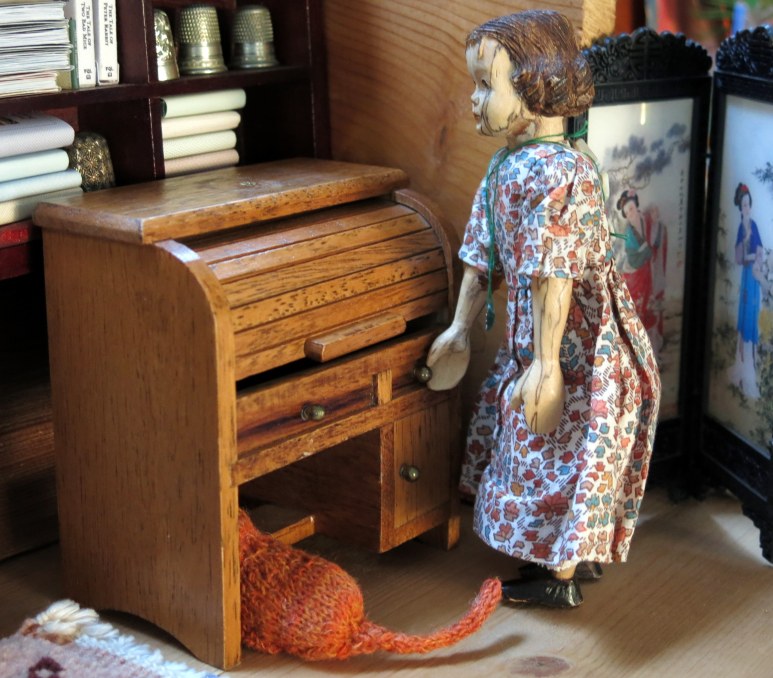 Tansy is usually the handy-Hitty of the cupboard, but in her absence, Eugenia decided to have a go at removing the back of the desk herself.