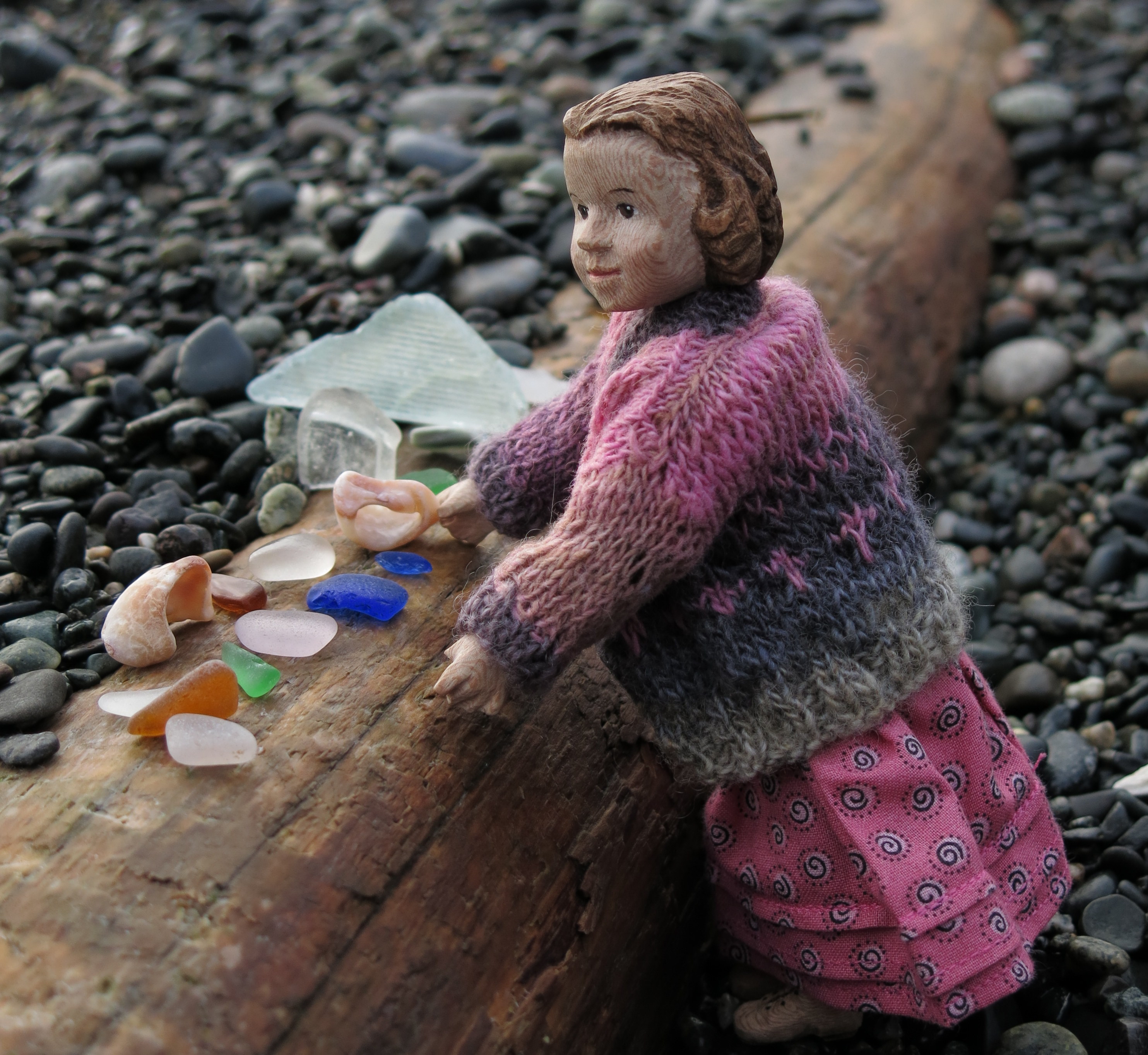 what an interesting walk on the beach and what a lovely little beach comber! I love all the pretty glass she is collecting. She certainly looks snug in that cute sweater.