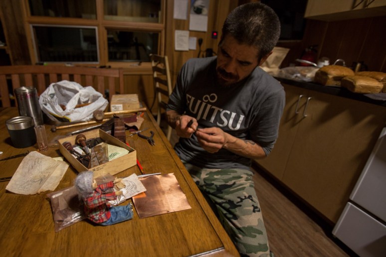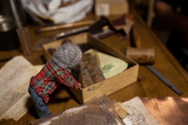 One stormy November evening on SGang Gwaay Tansy spent some time with one of the other boardwalk builders: Paul Rosang, a Haida artist who uses traditional tools and inherited designs.
