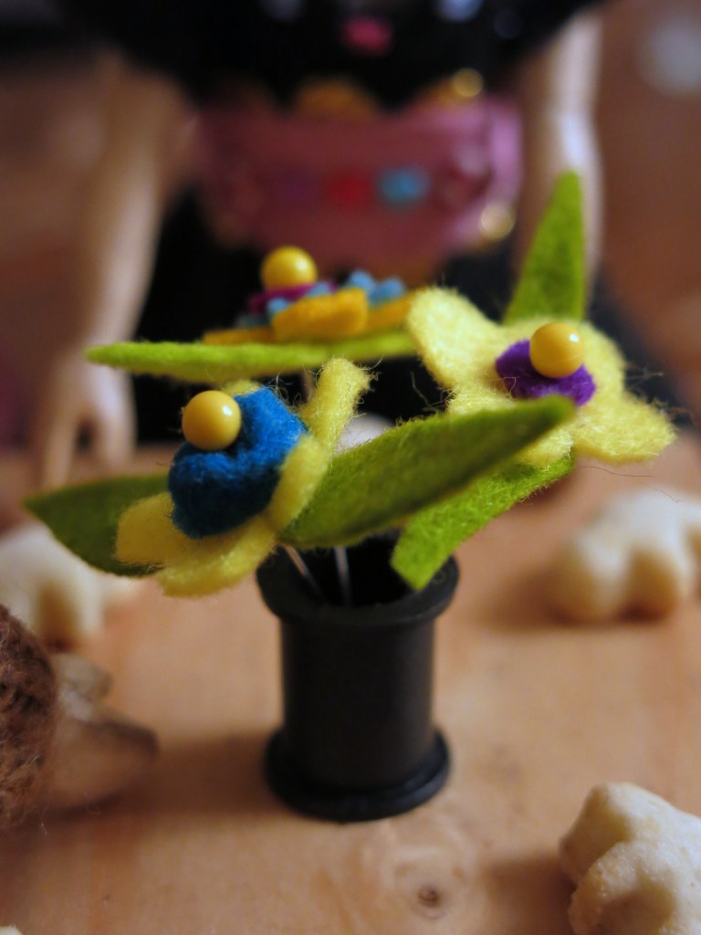 They are made of scraps of felt, with pins stuck into purple slime in the middle of this tiny cotton reel.