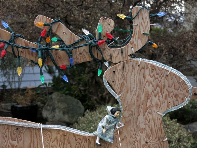 Then she climbed on a reindeer, but Santa wasn’t there. He was probably resting too.