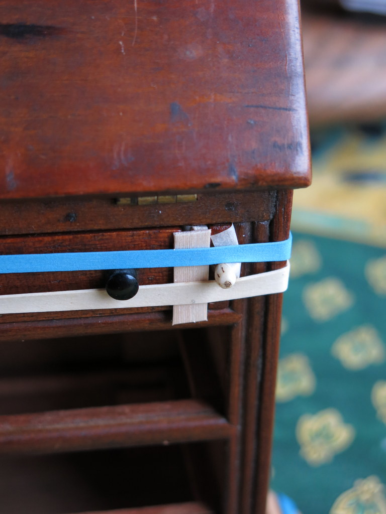 The Quimper Hitty human discovered a very small and lovely old writing desk in an antique store…after repairing the hinges, and making some new mouldings we had to glue them on…we used Titebond wood glue, and applied it with a toothpick.