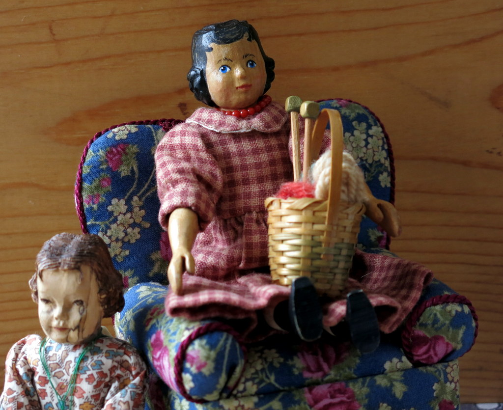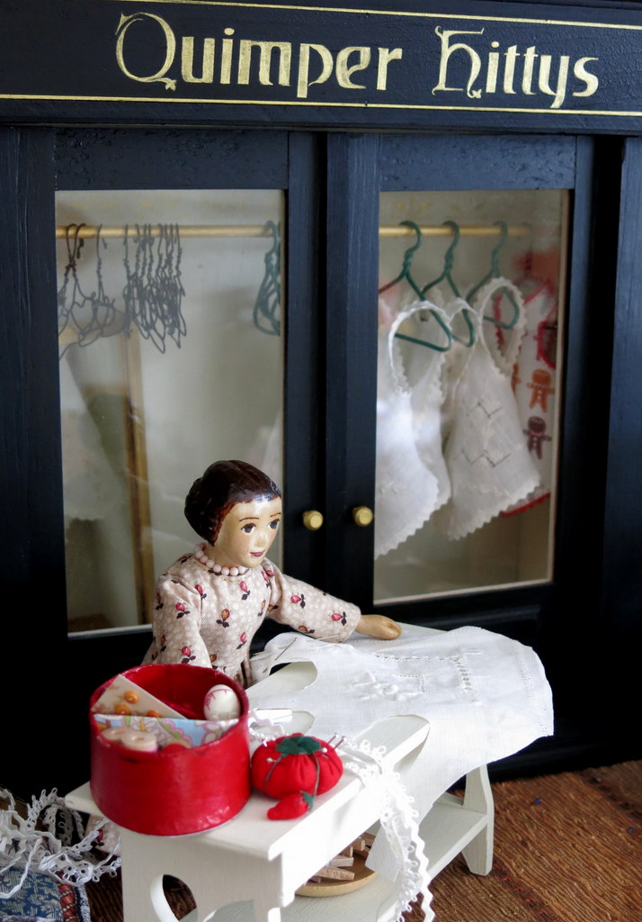 One of my good friends gave me the embroidery hoop – coincidentally I gave her one at the same time! That was funny! Eugenia has been wanting to learn to embroider, as her wood is too delicate for some of the more exciting adventures that the other Quimper Hittys are wont to indulge in!