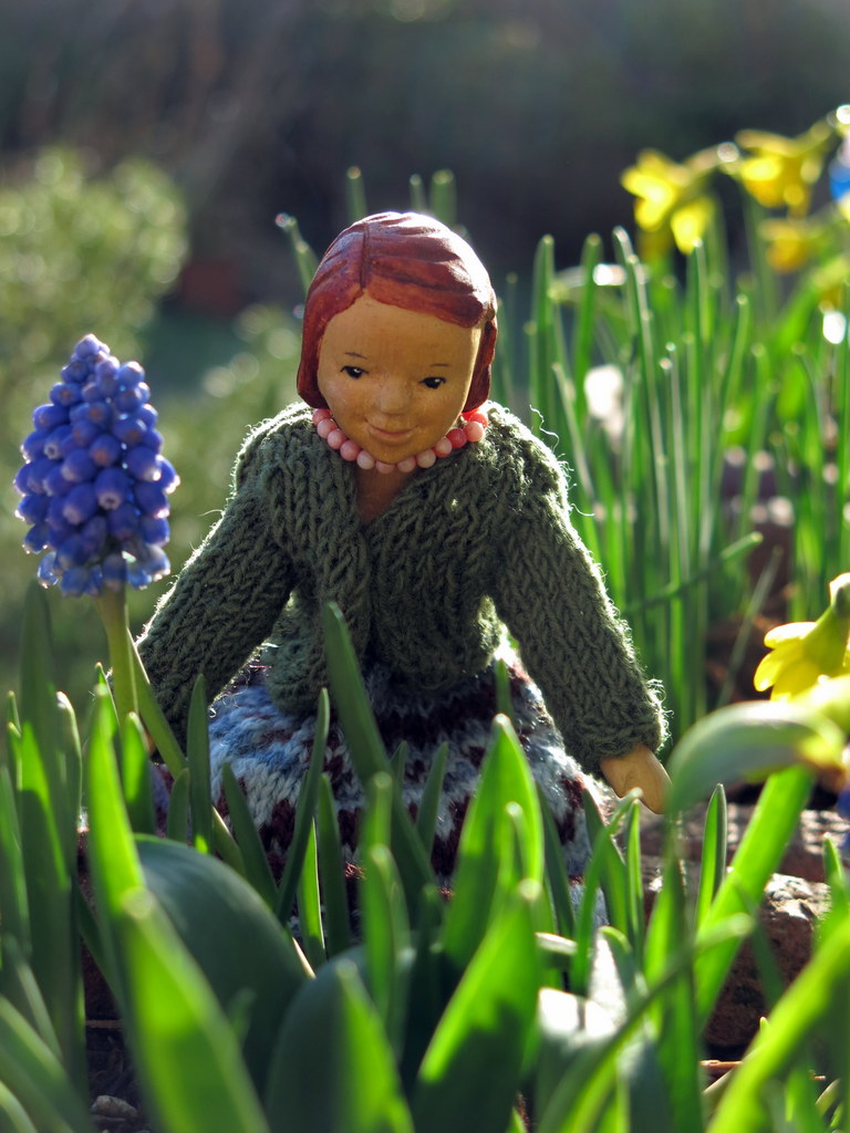 1. Although sunny here today, flowers will not show their pretty faces for a couple of months yet so yes, it is delightful to see such beauty in your region and as noted, with such a pretty outfit on your lovely wooden doll.