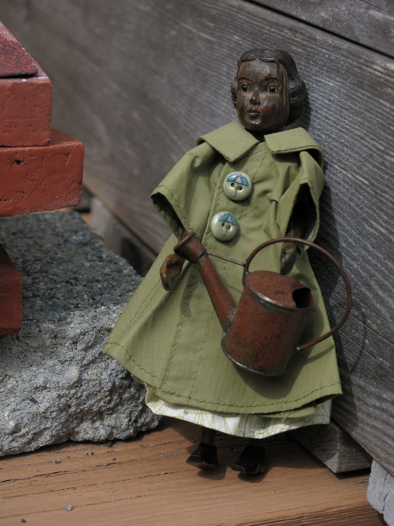 We are all pleased with the stump garden, but Perdita especially so. Her coat is one of the first I ever made for a Hitty – the buttons are hand made ceramic, purchased in Argentina!