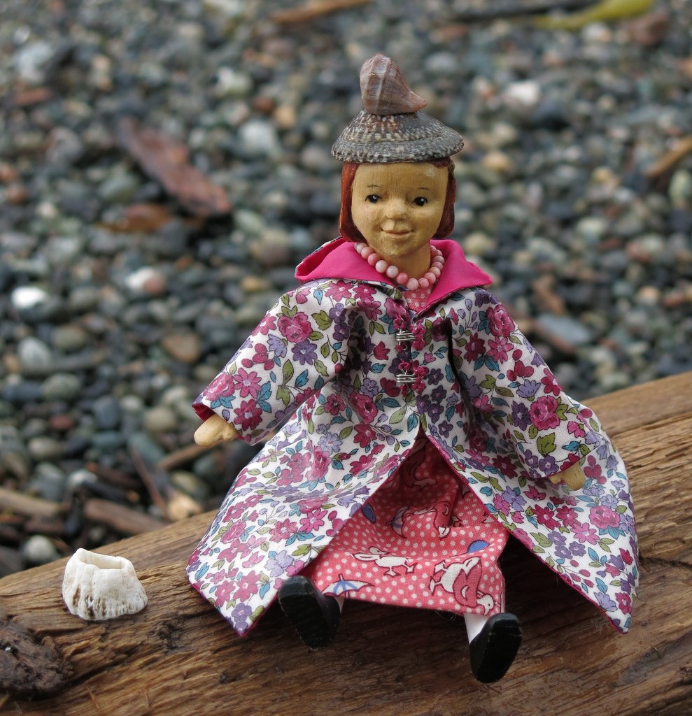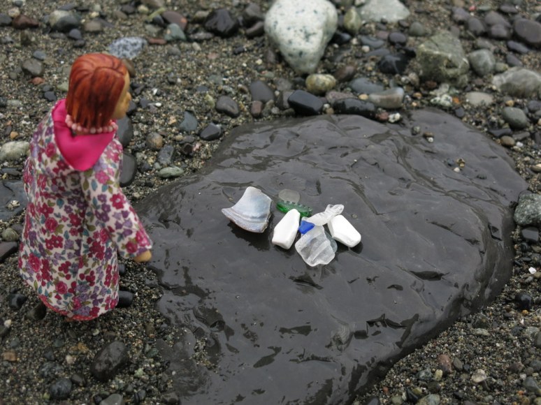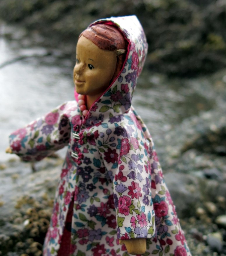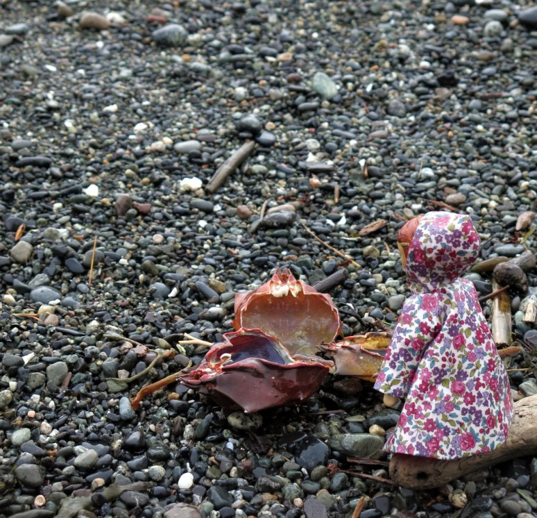 Aurelia is happy to try out the new raincoat and she loves the dress! We do love visiting the beach in the rain – it is peaceful, and we see interesting things…like our favourite otters!