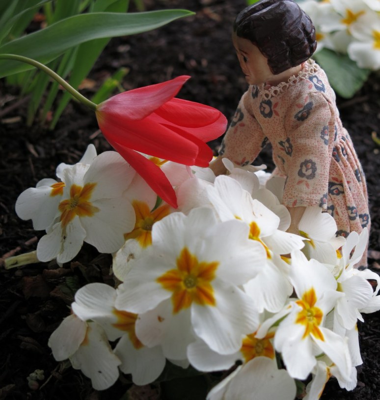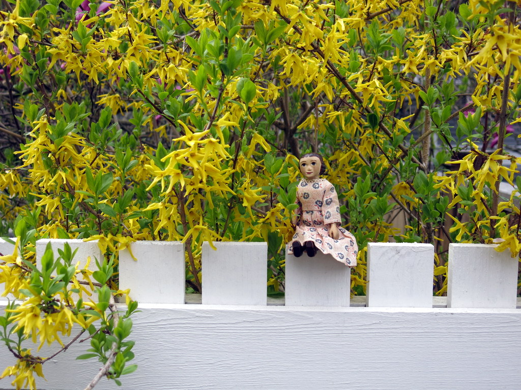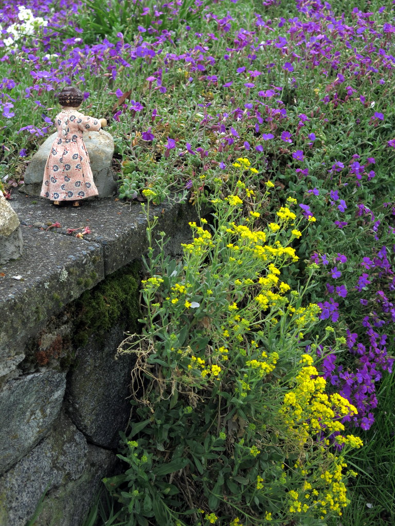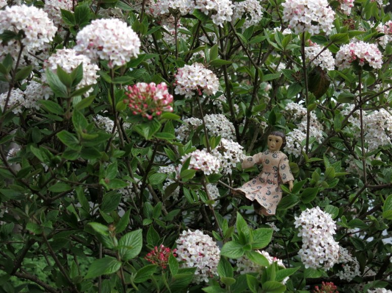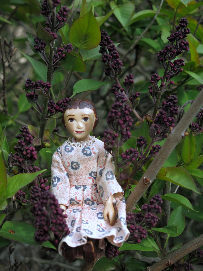 Constance started to feel a little shabby next to all the lovely new spring growth, but her dress is made from a special historic scrap of fabric – given to the Quimper Hitty Human by her grandmother…
