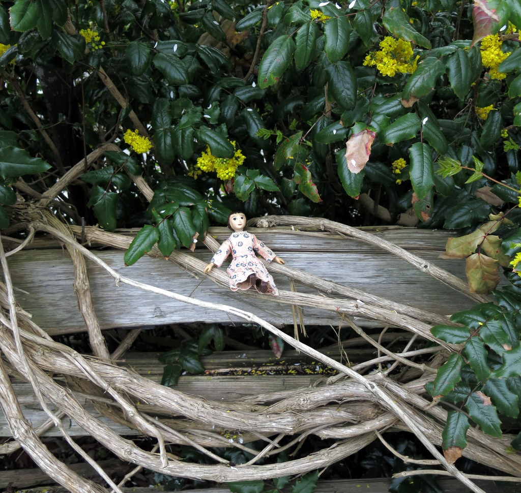 We love looking at the Oregon Grape flower clusters, and Constance thought the Clematis Montana vine was a perfect place for a short rest…