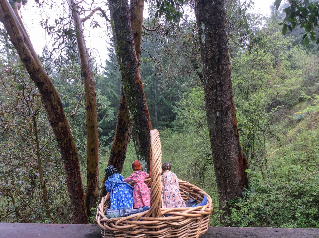Tatty, Aurelia and Constance hopped into the traveling basket for a trip through the dripping wet rainforest..