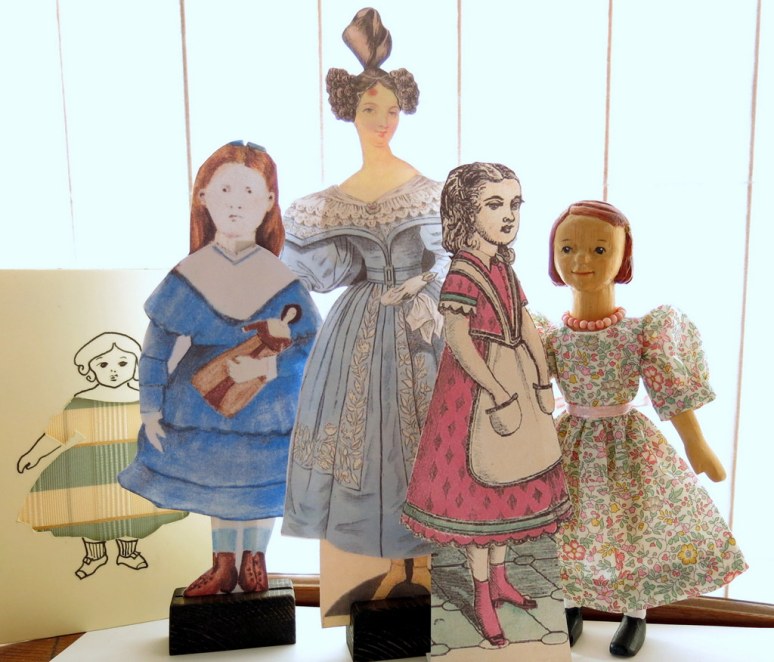 We came home with (from left to right) an overlay doll; a hand-painted paper doll made specially for the workshop; and two reproduction 19th century dolls. She was glad to meet her distant cousins, but although Aurelia exerted herself and was polite, conversation was stiff and two-dimensional. She decided they don’t have all that much in common after all except for their pretty frocks!