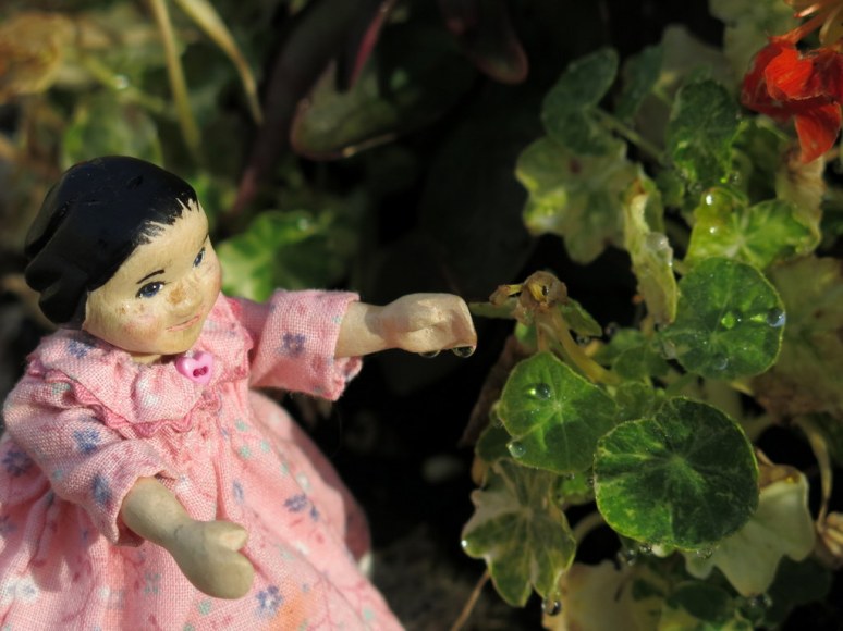 It is a dry time of year in our garden, but early in the morning Gilly found some drops of water on the Nasturtiums…