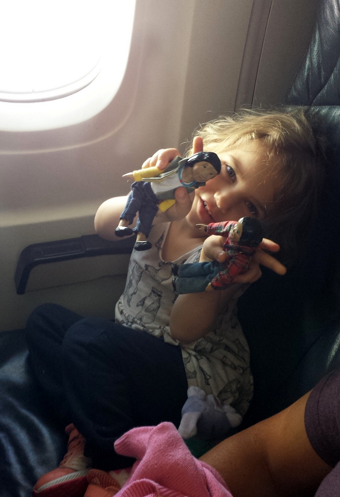 The little girl walked the wooden girls all over the armrests and tray tables, had them chatting to each other, put them to bed, woke them up, and was interested in changing outfits…