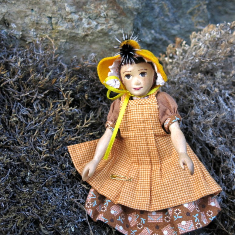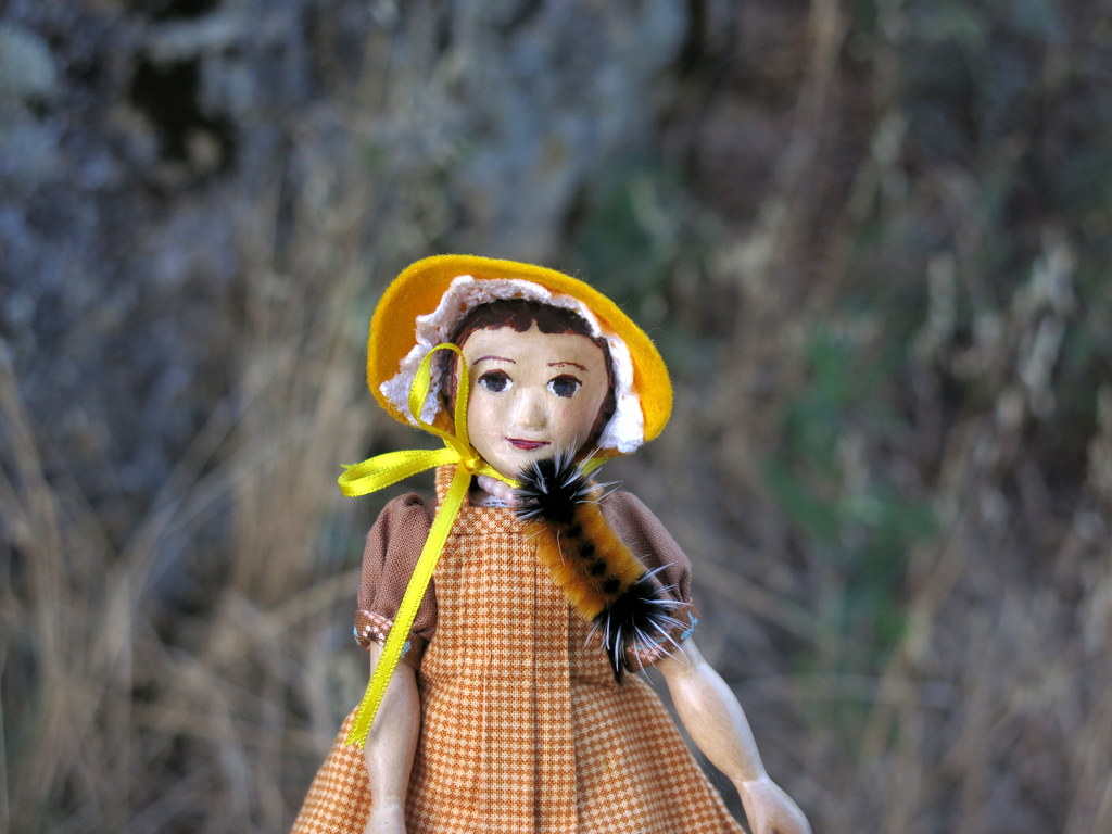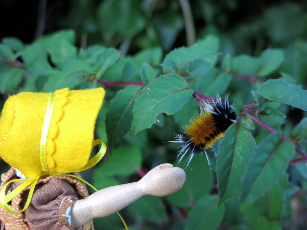 The Woolly Bear was quite placidly determined to explore Constance from toes to Bonnet!She didn’t mind though she was very glad when he finally decided to explore the Fuchsia bush!