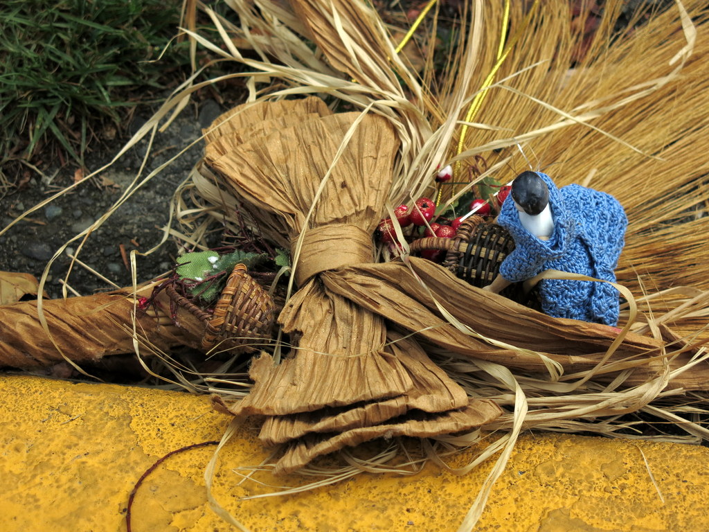 We found a decorated broom in the gutter. Guttersnipe snagged one of the baskets…