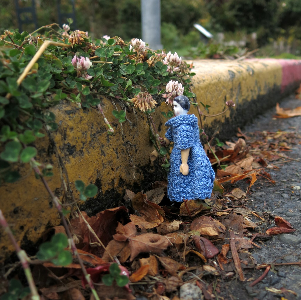 I just noticed her little boots with heels! What a great walk in the gutter!! we have not gutters out here in the country ..just some very weedy ditches that poor little dolls can not walk thru. Hope that Jane can create something quite tasty with Guttersnipe;s find!