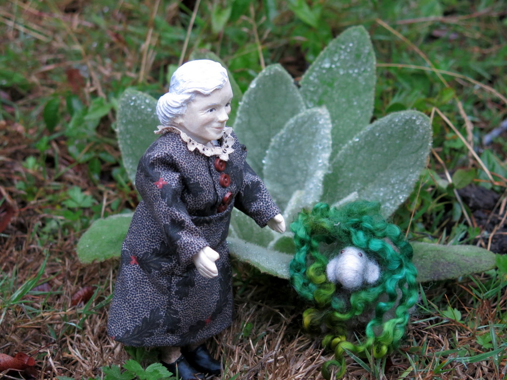 Mormor was going to make yarn, but first she needed to find the right coloured sheep  – the green ones can be hard to find. Finally she spotted one among the Lamb’s Ears…