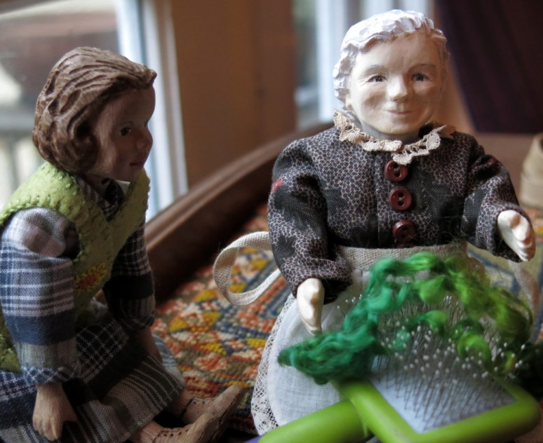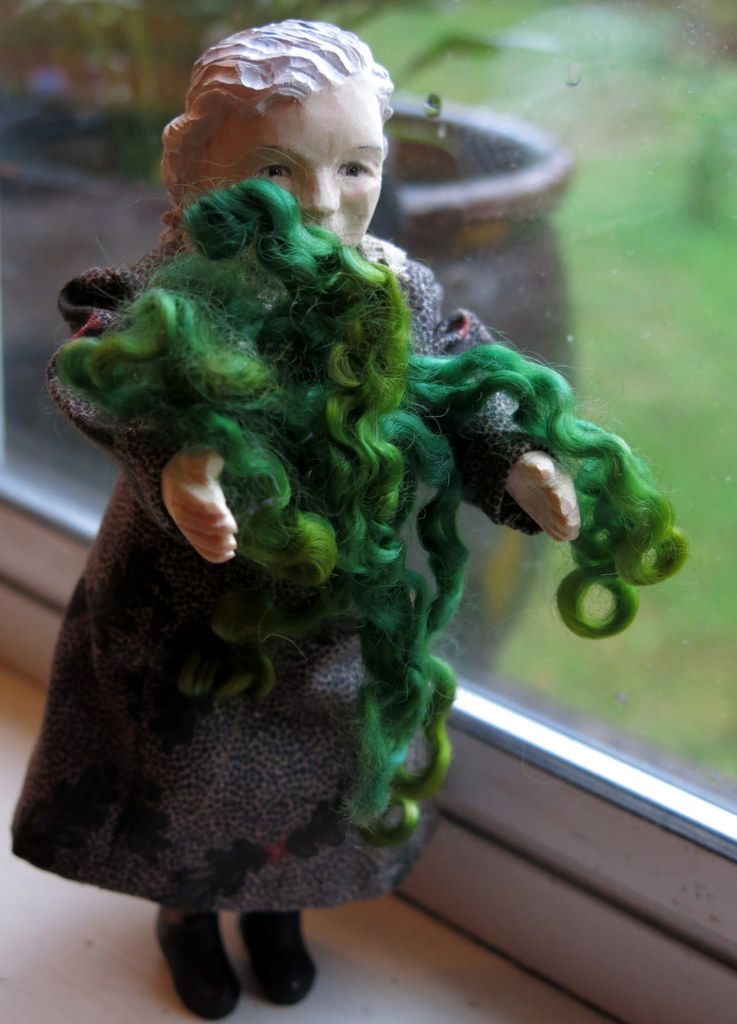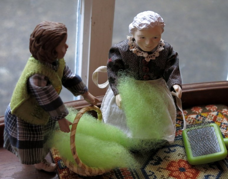 The locks need to be carded, and Mormor says the cat’s hairbrush makes a fine carder for Hitty-sized projects.  The lock of wool is held in one hand, and brushed with the carder, as though brushing a girls hair, but allowing the wool to be pulled into the carder. All the hairs get aligned in the teeth of the carder. A lot of seeds and bits of plant fall out while you are doing this so it is good to wear an apron. Humans often use two carders.