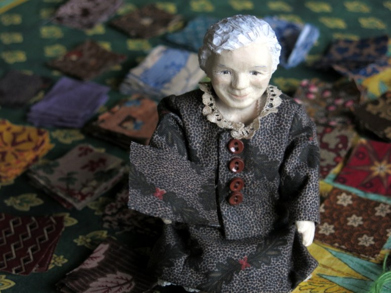 Mormor has such a wonderful gentle expression. The new quilt is so precise and well pieced.! The Country HIttys and I are in awe of how well all those squares match up. What fun that one of the squares was so recognizable to her.