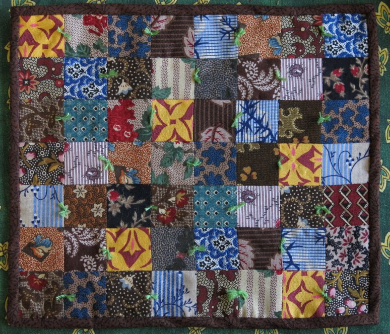 my parents owned a country store and my Mom made quilts like this with men’s suiting samples, worsted wool. We all had them at our summer cottage. As a child I used to untie the yarn knots and use them as doll’s hair ribbons. Mormor’s quilt is beautiful and I see her fabric piece.