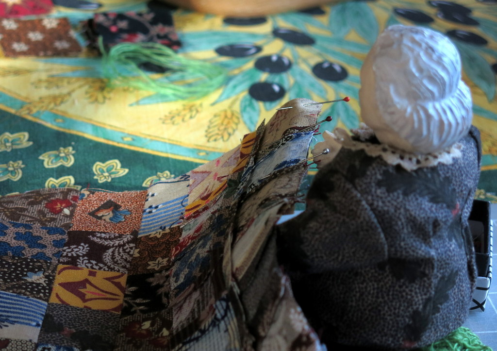 …and a backing fabric pinned into place. Little quilts like this one don’t get batting or they will end up too stiff. Then the binding is sewn on…