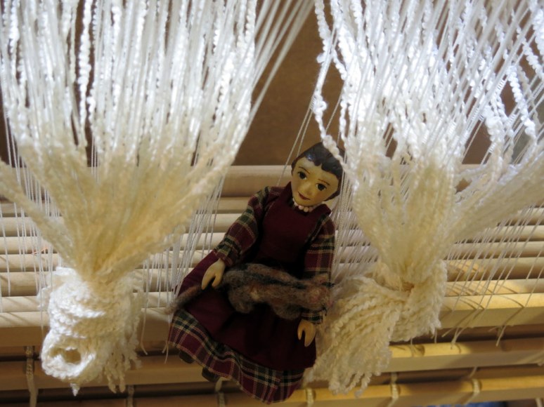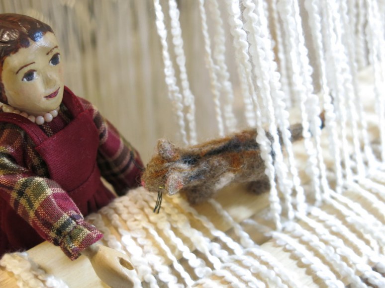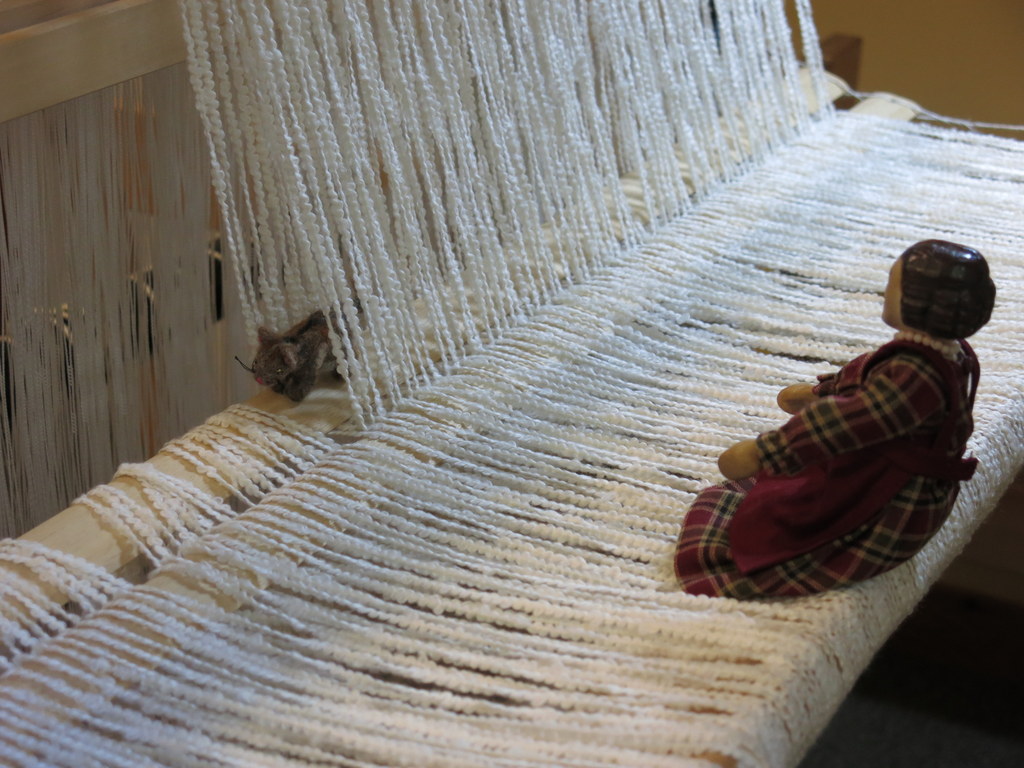I quite like this part of the process – dressing the loom before weaving, and having feline and Hitty help is a given around here!