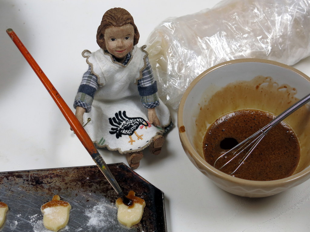 Arianell’s name means “Silver” in Welsh…so of course she was chosen to help make these very special cookies. We made the plain sugar cooky dough from Fannie Farmer’s cookbook, chilled it, then rolled it out. Next Arianell cut them out with the acorn shaped cooky cutter.