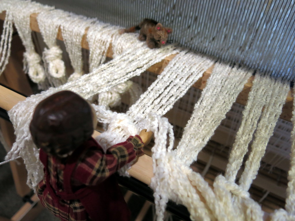 …and next the warp ends are tied to the front apron…cat is very helpful as usual.