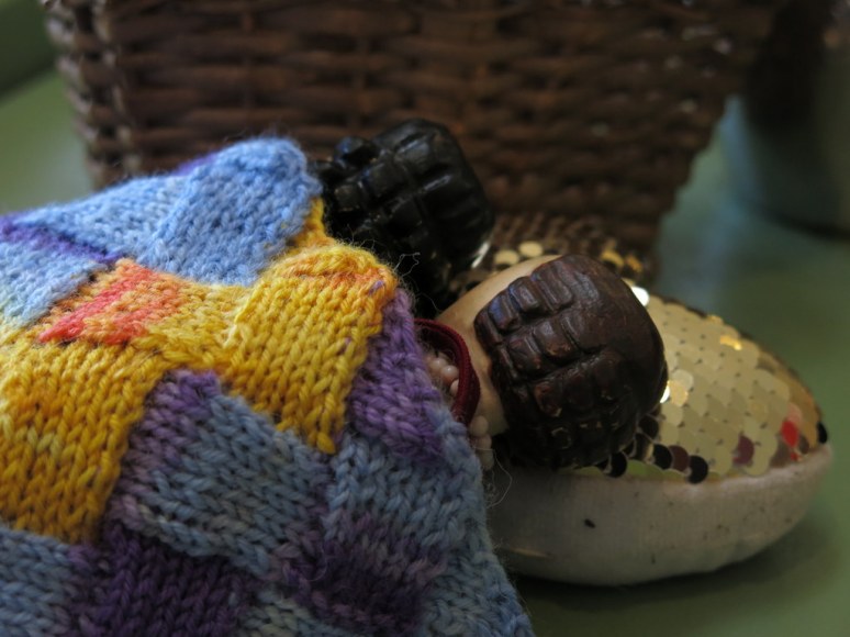 Then they had a short nap – luckily the youngest human was prepared for Hitty naps with a magical sparkling heart-shaped pillow, and an entrelac blanket in her pocket!