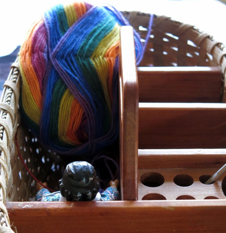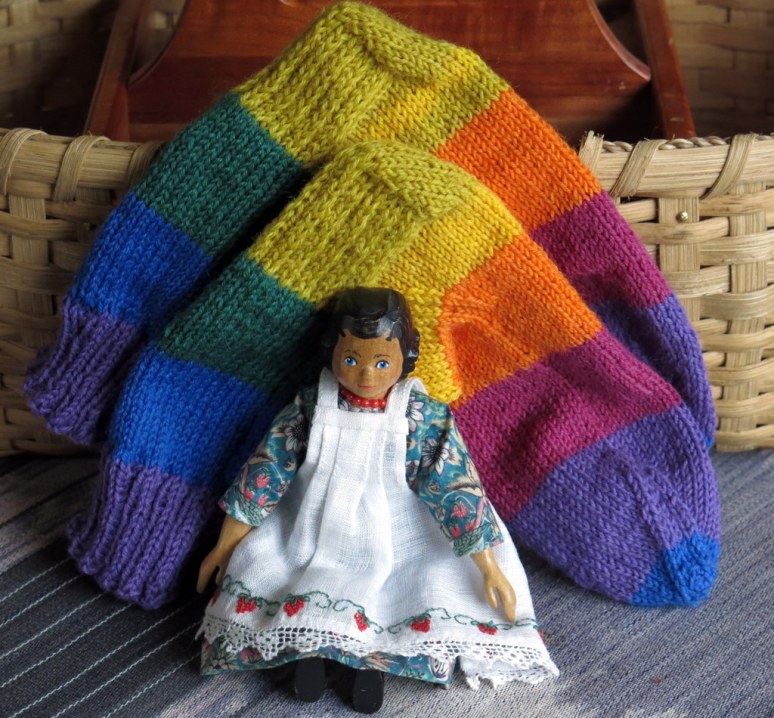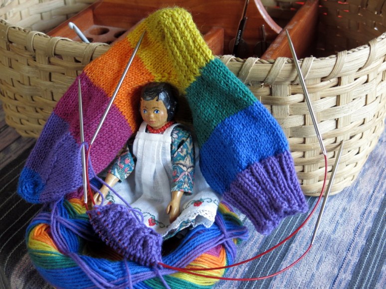 • Well-spotted – that is our magical basket from the Ozarks! Our craft projects are organised and turn out beautifully when they begin in this basket…we’ve had it almost exactly a year now, and it is already the source of many pairs of socks! Rainbow socks are grand – how could anyone not smile at them!