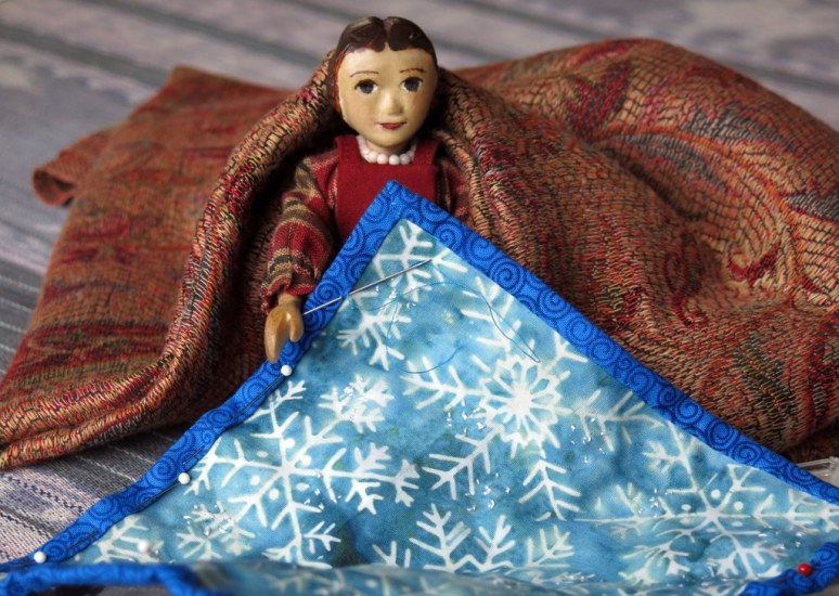 The snowflakes were an inspiration after I had already started “stitch in the ditch” outlining the centre star…it just didn’t look right to me so I unpicked the stitching and pondered what the quilt really wanted. Luckily I thought of the simple snowflakes. It is very satisfying to make such a tiny pretty quilt!