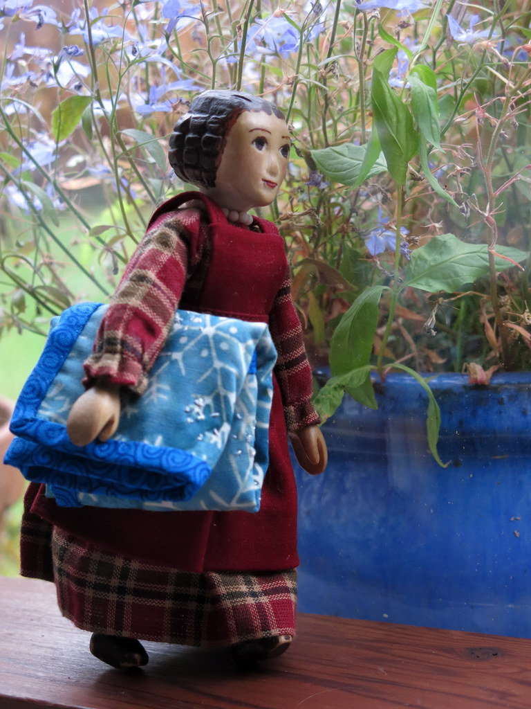 Constance was proud of it! She explained how we made the quilt…Arianell listened with rapt attention…she’d like to try quilting. Rose thinks she’ll stick to knitting, though she may try that colour combination in her next pair of “Hitty Sleeping Bags”. All Min can think of to say is Wow!