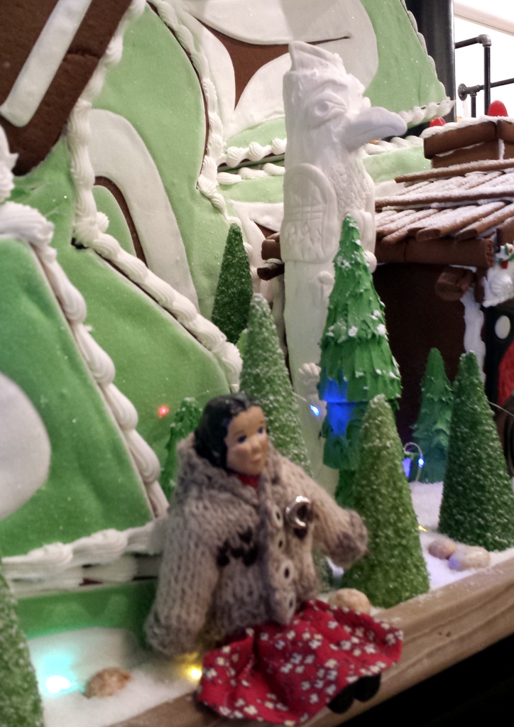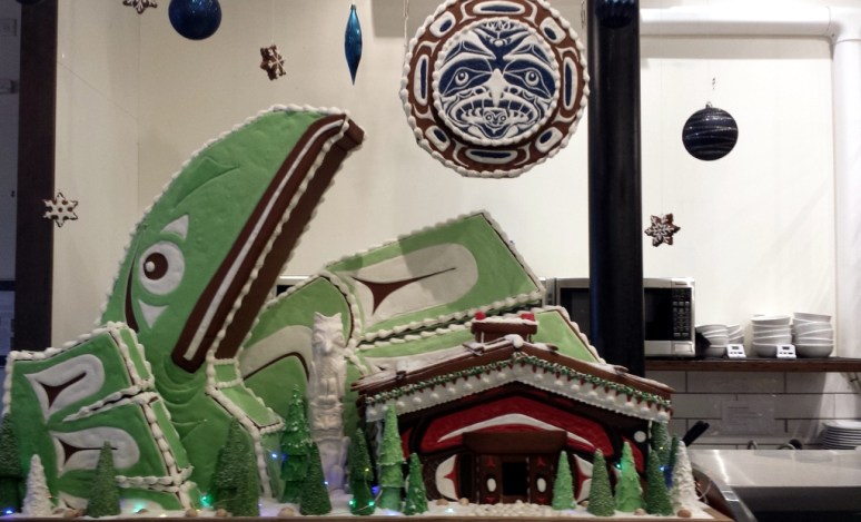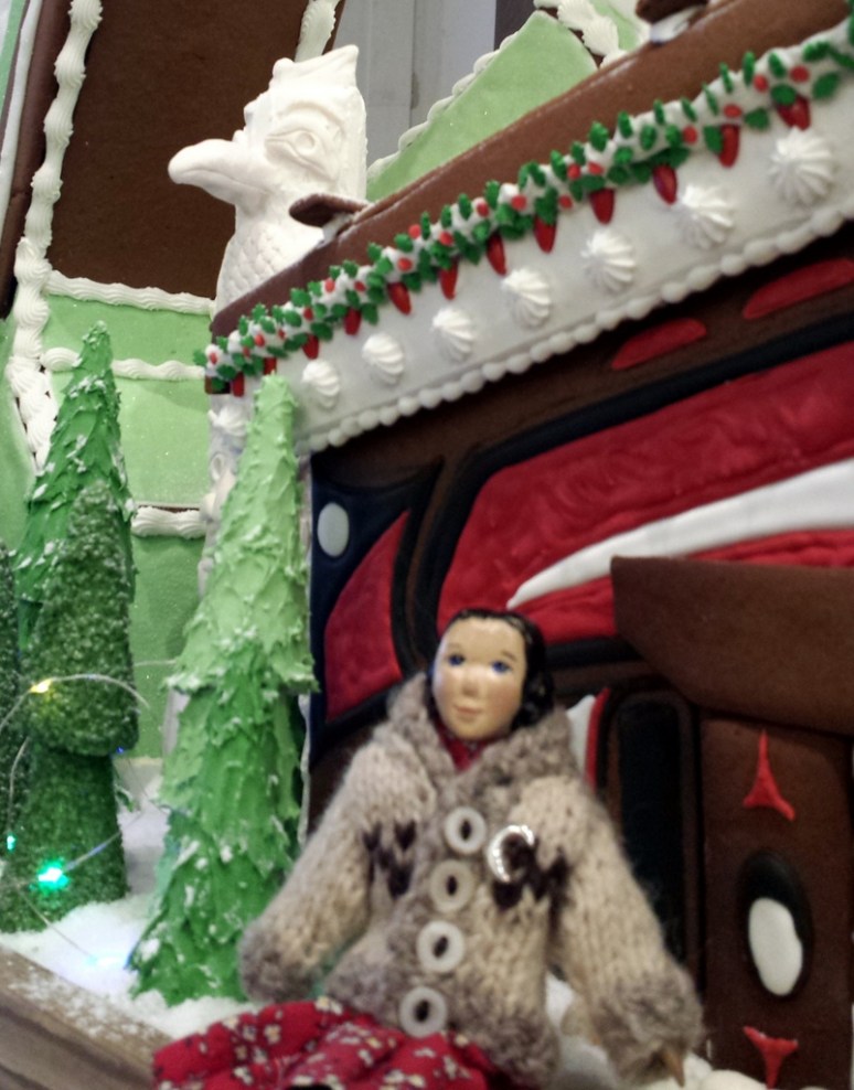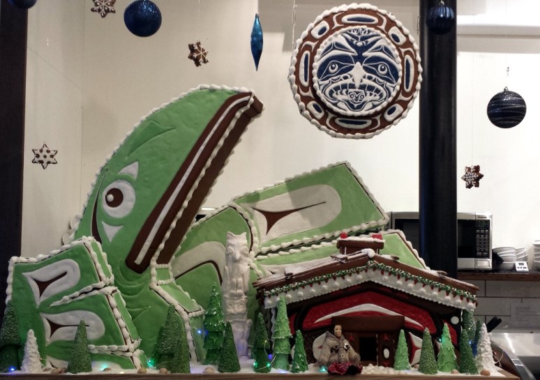 We don’t know if this spectacular gingerbread creation depicts a particular story in the Kwakwaka’wakw tradition, but we do know of a story about Raven stealing the light – that would fit in to this dark and wintry time of year.