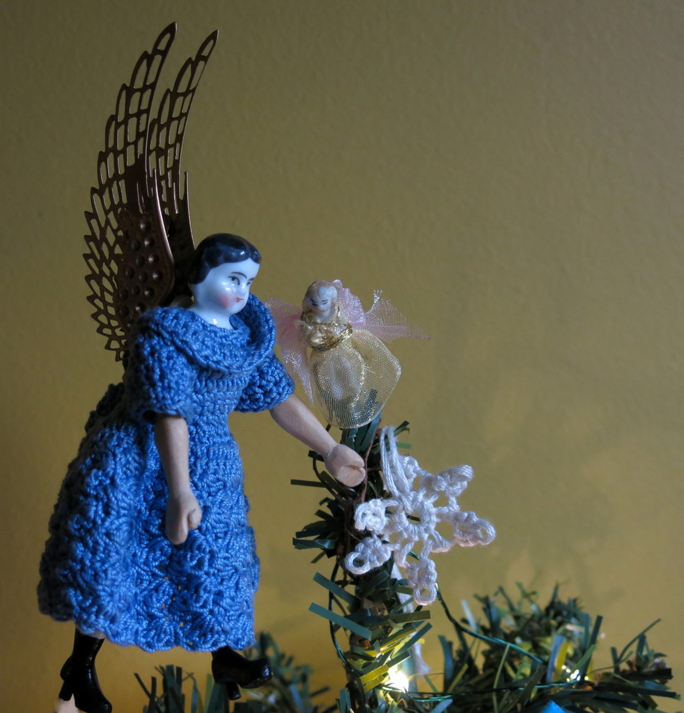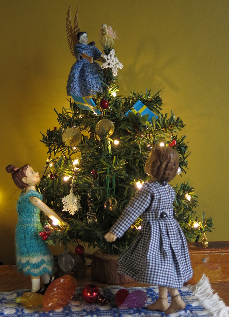 After a century and a half of being lost, forgotten and buried in river mud, Mudlark was extremely gratified to be the Christmas Tree Angel! The humans have had a Hitty-angel for the last few years, but their new tiny tree could only support a tiny doll.