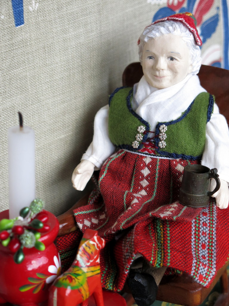 Mormor looks adorable in her Swedish clothes…I just love her…and that Dala Horse wall hanging is awesome. The entire photo is great.