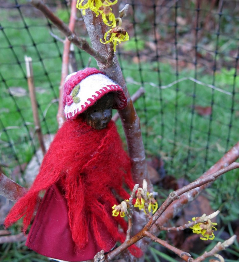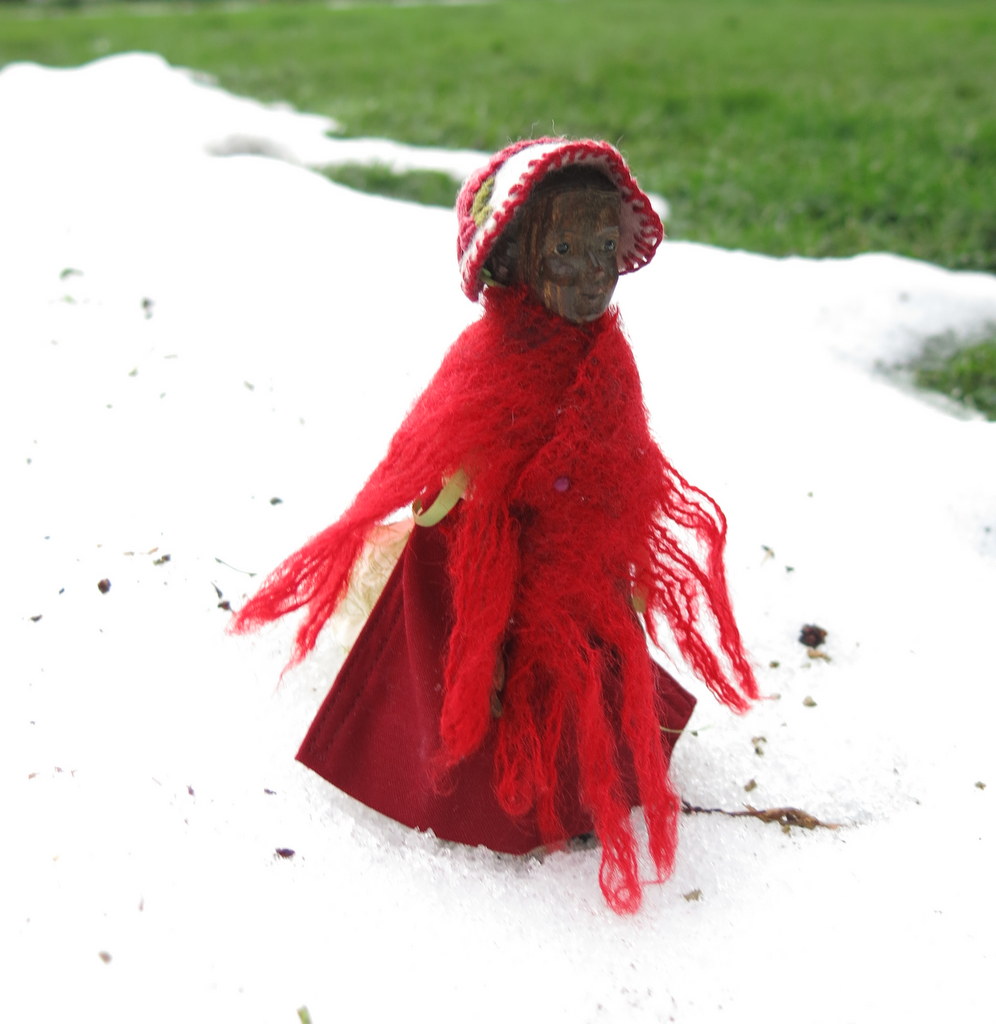 I can ditto Mary Anne’s comments on the weather in her area as it is similar here in the Midwest. But, Perdita does bring such cheer even though the weather is less than easy to maneuver about it for a wee doll. Her bright red outer, winter wear is uplifting.