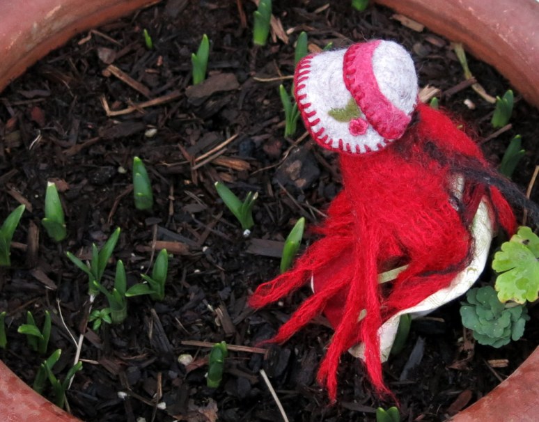 Her red shawl is the scrap corner of a plaid woolen blanket the rest of which was cut up to make some tam-o-shanters for a historical recreation…we tried to use every scrap! Perdita was wishing for the rowboat as she splashed around in the lower areas of the back yard!