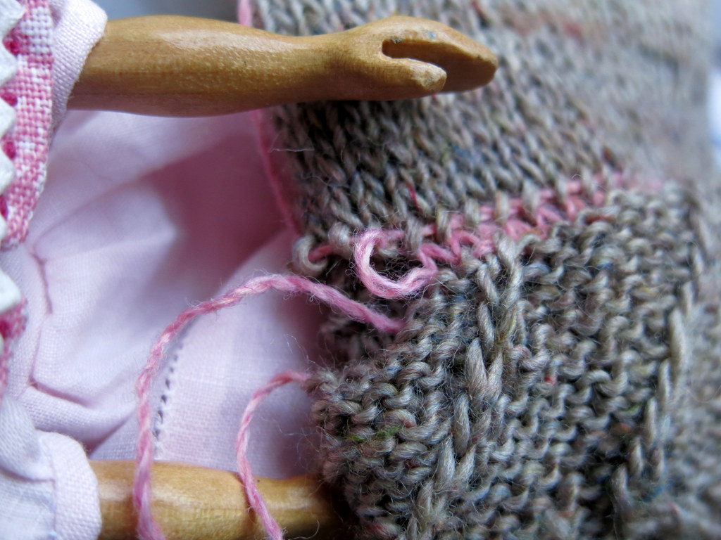 …the set-up includes a row of pink waste yarn knitted into the sock where the heel will go. The rows above and below the set-up row were threaded with waste yarn, which will help with the next step…
