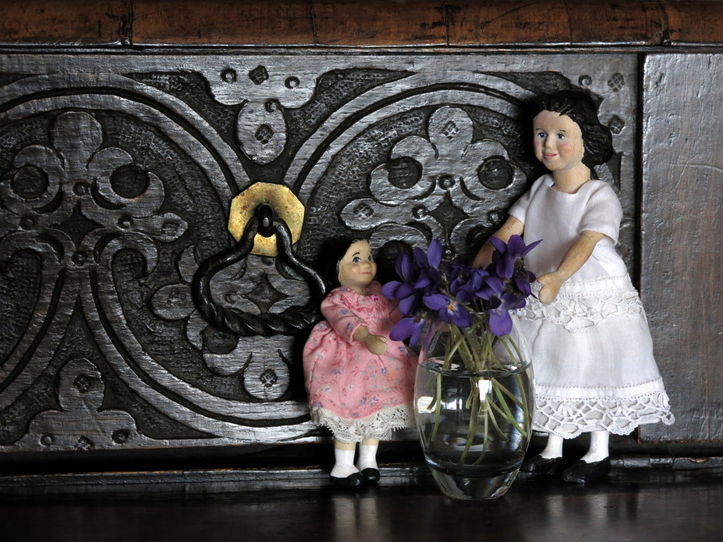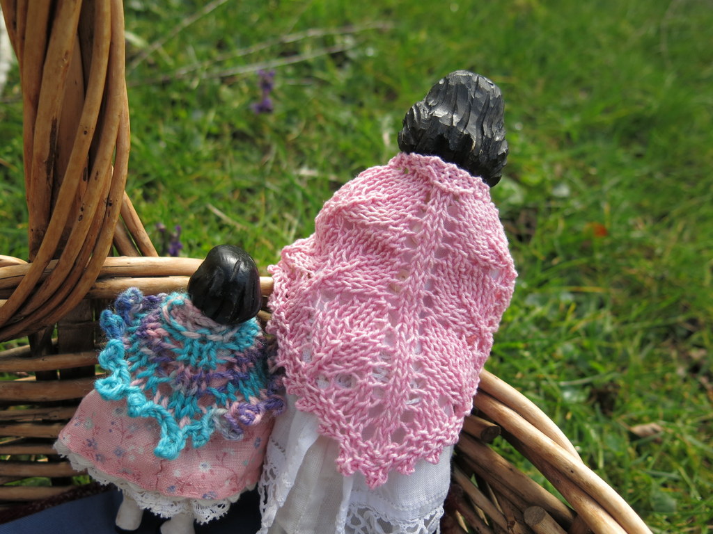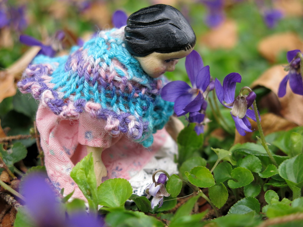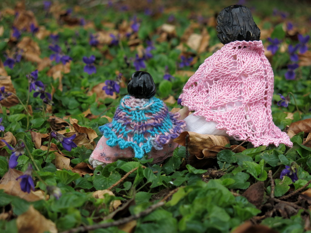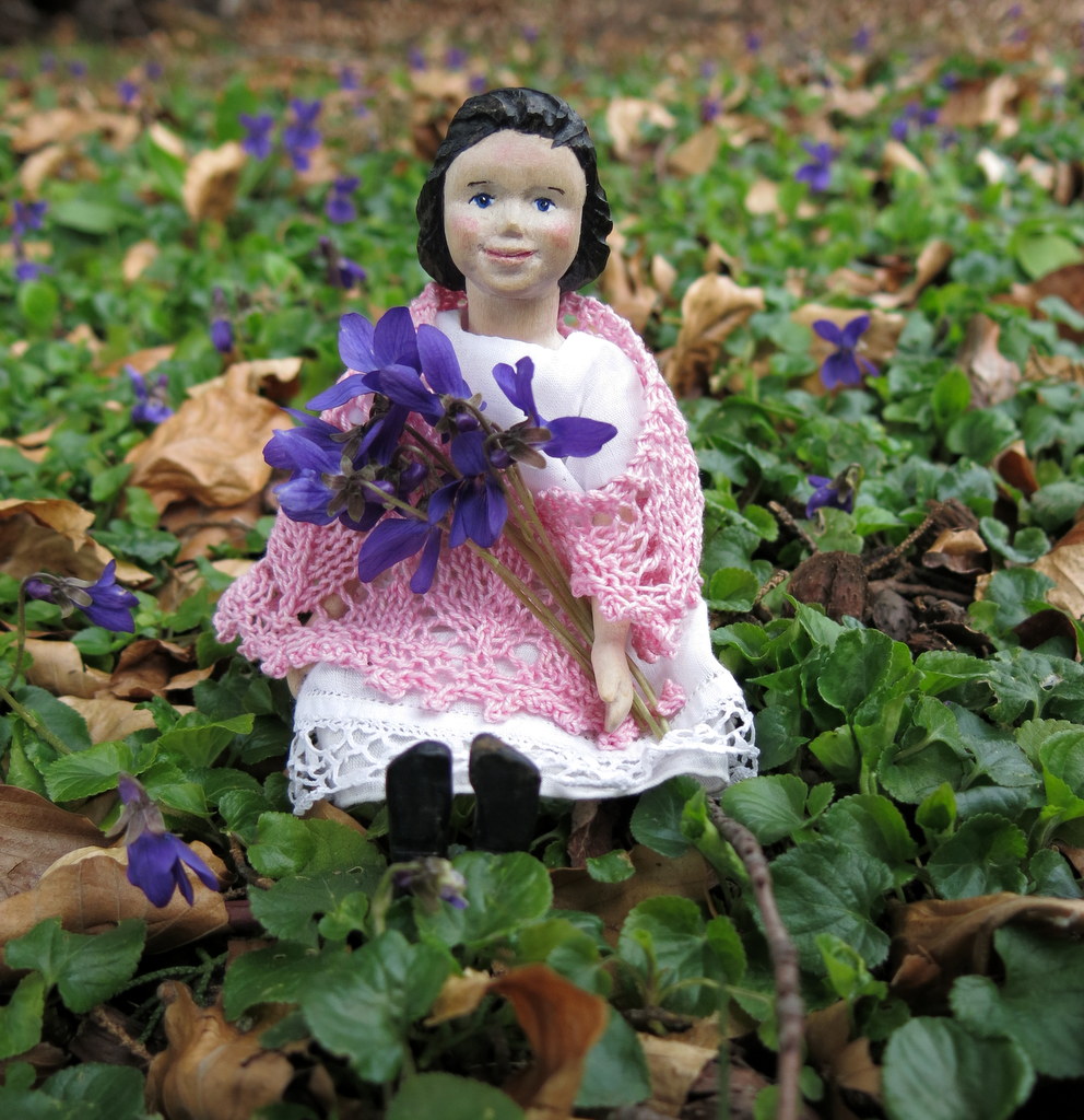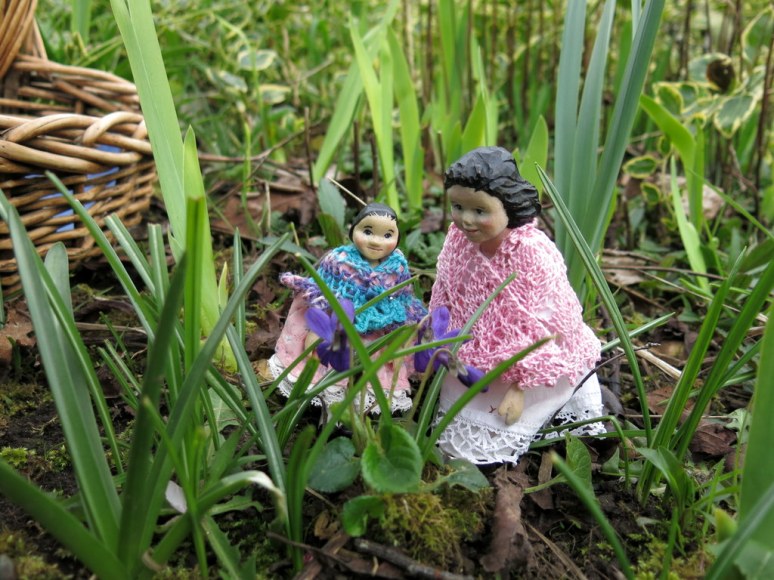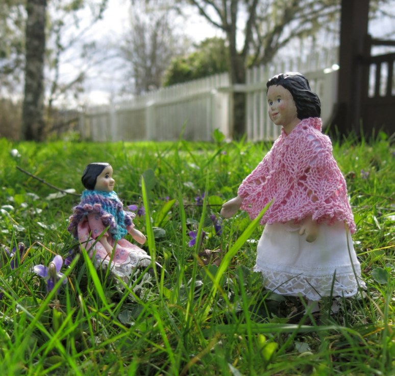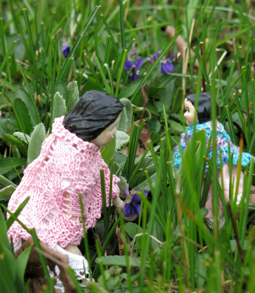 what a pretty area of violets. Too early here which makes the girls foray all the more welcome. they look so sweet in their lacy shawls . Love that tiny vase!